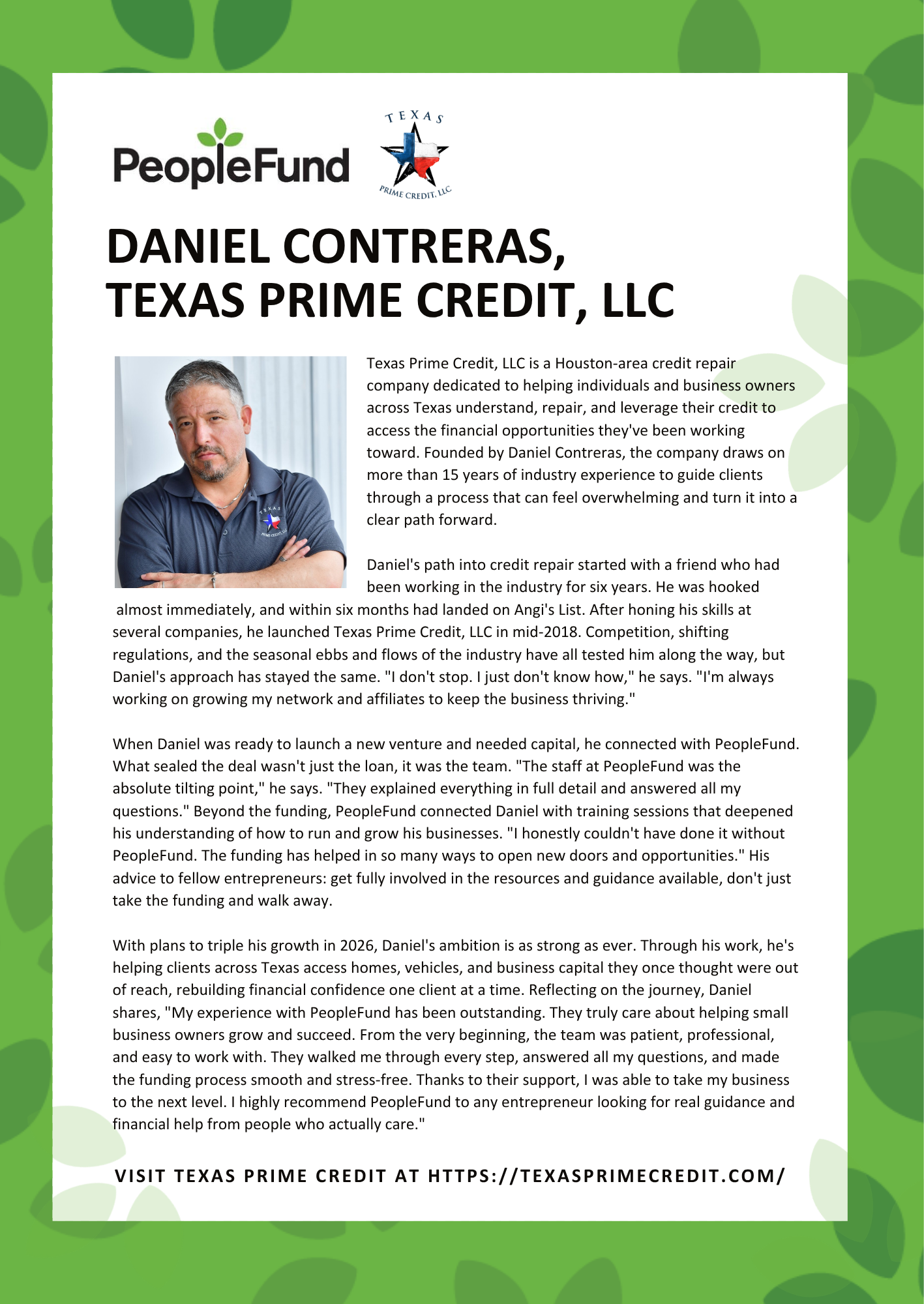 Apr 222026 Client Spotlight: Daniel Contreras, Texas Prime Credit, LLC Posted by Hansa Sreemanthula in Client Success, Small Business This entry was posted in Client Success, Small Business Bookmark the permalink.